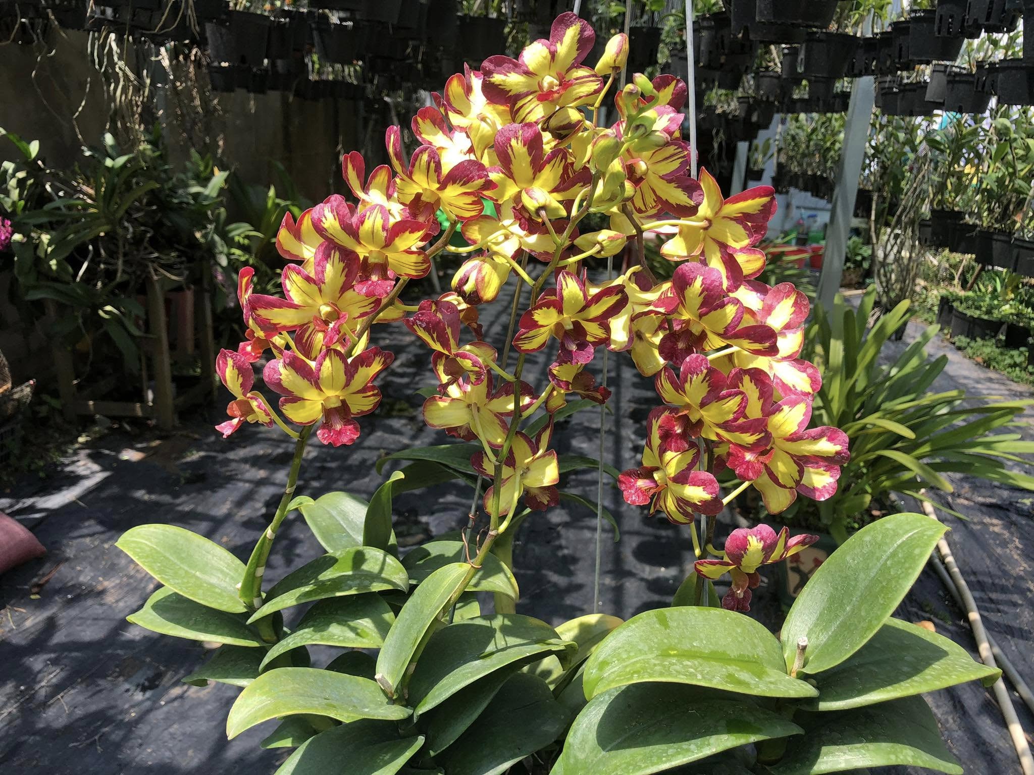 Hoa lan Denro chớp vàng đỏ xưa là một dòng lan Dendrobium mang vẻ đẹp hoài niệm, gợi nhớ đến những giống lan truyền thống được người chơi lan yêu thích từ nhiều năm trước. Cây có thân thẳng, dáng gọn, lá xanh đậm và khỏe, khả năng sinh trưởng ổn định, thích nghi tốt với điều kiện khí hậu nóng ẩm. Hoa mọc thành chùm dọc theo thân, cánh hoa có sắc vàng tươi điểm ánh đỏ hoặc viền đỏ nổi bật, tạo hiệu ứng “chớp màu” bắt mắt và rất đặc trưng. Màu sắc hoa không quá rực nhưng hài hòa, mang nét đẹp mộc mạc, gần gũi, càng nhìn càng cuốn hút. Lan Denro chớp vàng đỏ xưa thường cho hoa bền, nở đồng loạt, phù hợp trưng bày trong không gian sân vườn, ban công hoặc sưu tầm của những người yêu lan cổ, góp phần lưu giữ giá trị thẩm mỹ và ký ức của một thời lan truyền thống.