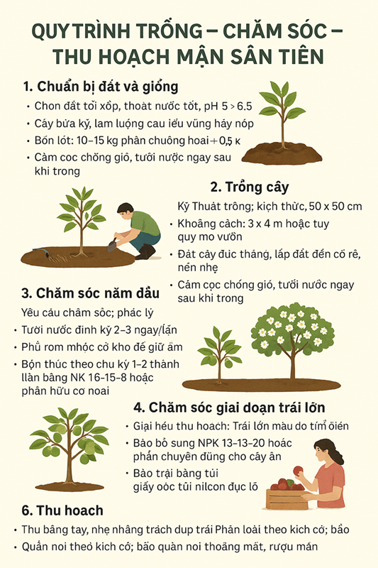 Mận hồng Sân Tiên là một giống mận đặc sản được nhiều vùng trồng ưa chuộng nhờ hương vị thơm ngon và khả năng thích nghi tốt với điều kiện tự nhiên. Cây mận có tán rộng, sinh trưởng khỏe, cho năng suất ổn định sau 2–3 năm trồng. Trái mận hồng Sân Tiên có hình dạng tròn hoặc hơi thuôn, lớp vỏ mỏng mang màu đỏ hồng đến đỏ tím khi chín, trên bề mặt thường phủ một lớp phấn trắng tự nhiên. Thịt quả giòn, mọng nước, vị ngọt thanh xen lẫn chút chua nhẹ tạo cảm giác tươi mát đặc trưng, rất được người tiêu dùng ưa thích. Ngoài việc ăn tươi, mận hồng Sân Tiên còn được sử dụng để chế biến thành mứt, siro, rượu mận hoặc sản phẩm sấy dẻo, giúp nâng cao giá trị kinh tế cho người trồng. Nhờ ưu điểm dễ chăm sóc, ít sâu bệnh và phù hợp nhiều loại đất, giống mận này ngày càng được mở rộng diện tích, trở thành loại cây trái có tiềm năng phát triển bền vững tại nhiều địa phương.
